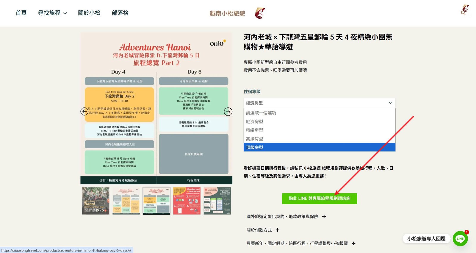 越南小松旅遊 台灣團隊費時數千小時親訪我們合作的飯店、郵輪、度假村。依房型設施、定價幫你按預算分成多種房型等級,讓你可以更快做決定。下訂前請務必與我們 LINE 專人客服確認空房後完成下訂,即可輕鬆出發!更多房型資訊請參考: